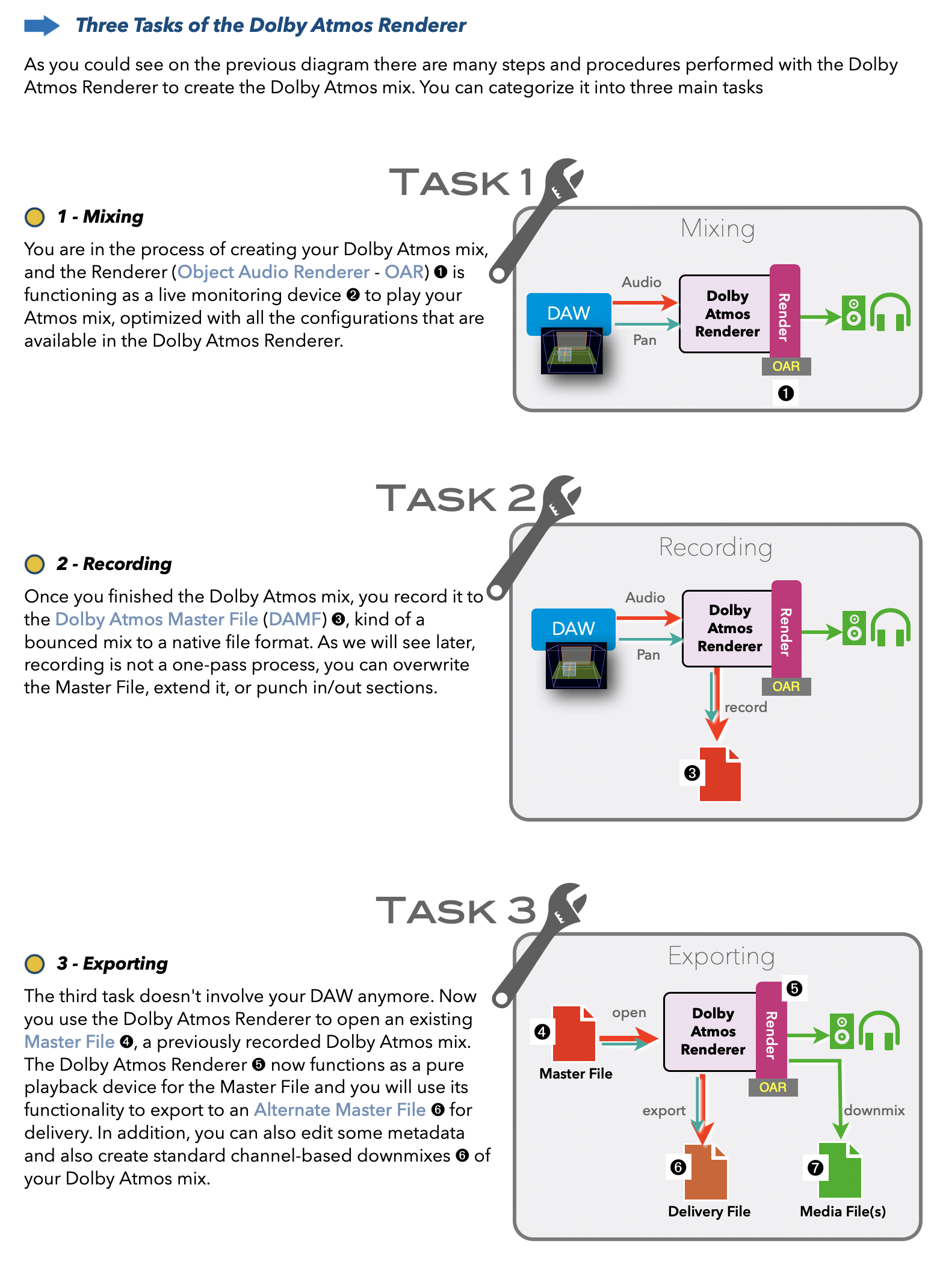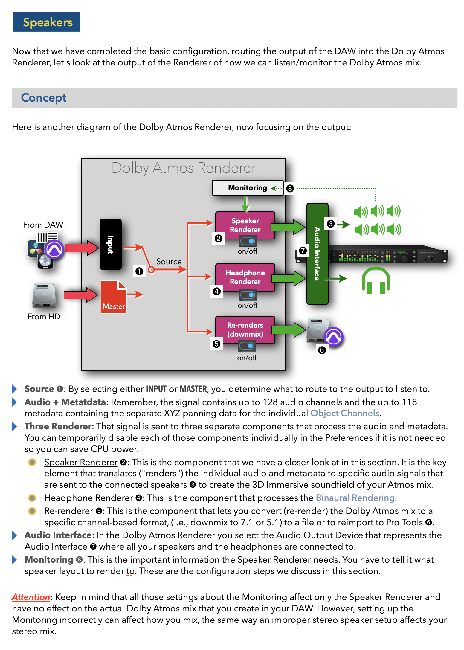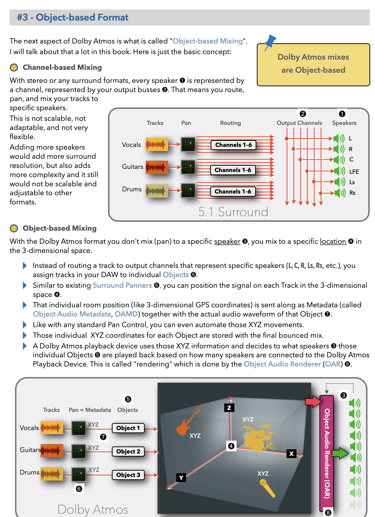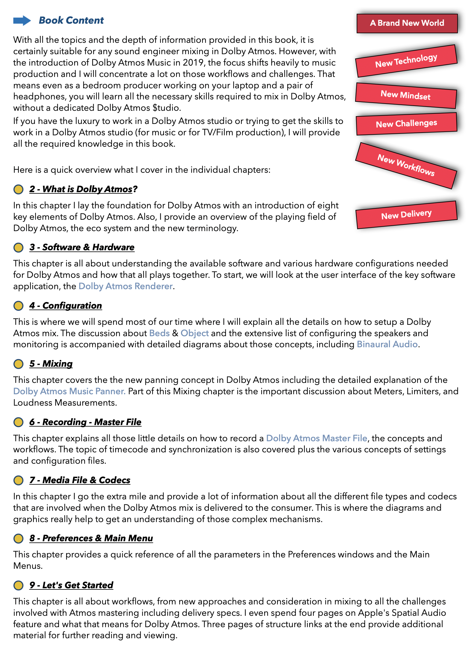 "Mixing in Dolby Atmos - #1 How it Works" provides an introduction into the Dolby Atmos eco-system, explains the required software application "Dolby Atmos Renderer" in all details and discusses new workflows and best-practices for mixing and mastering in Dolby Atmos. It also covers the delivery chain and the Dolby Atmos playback options for the end consumer.