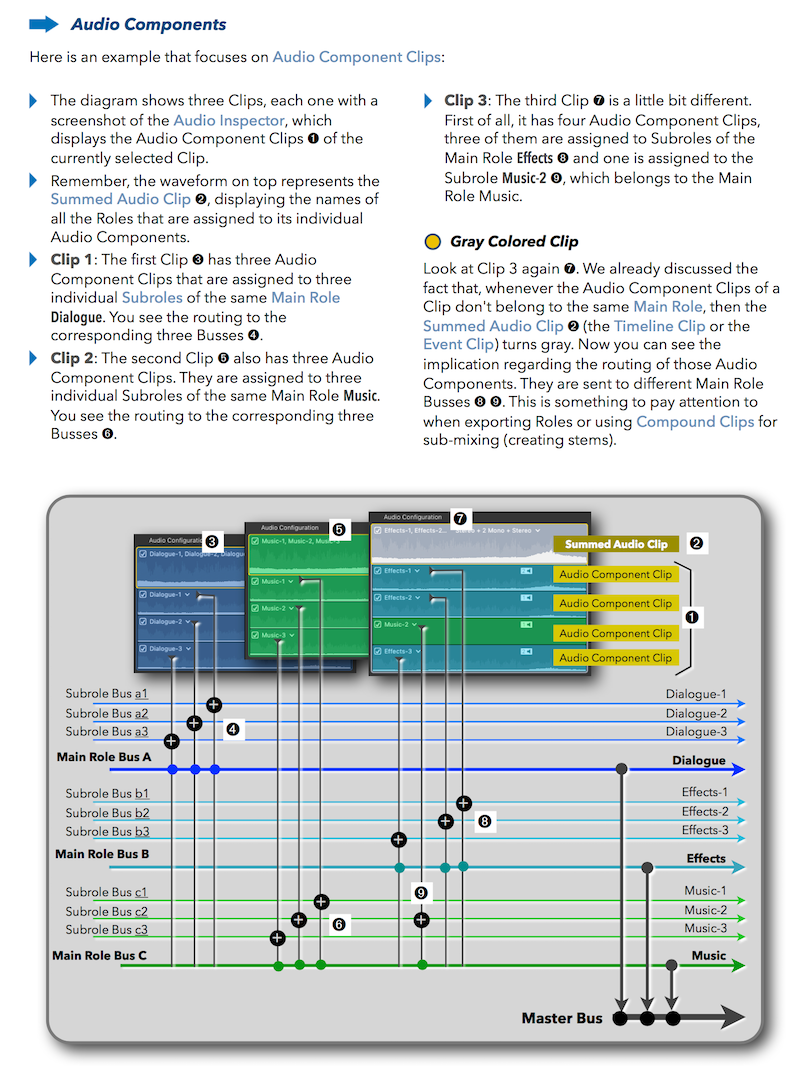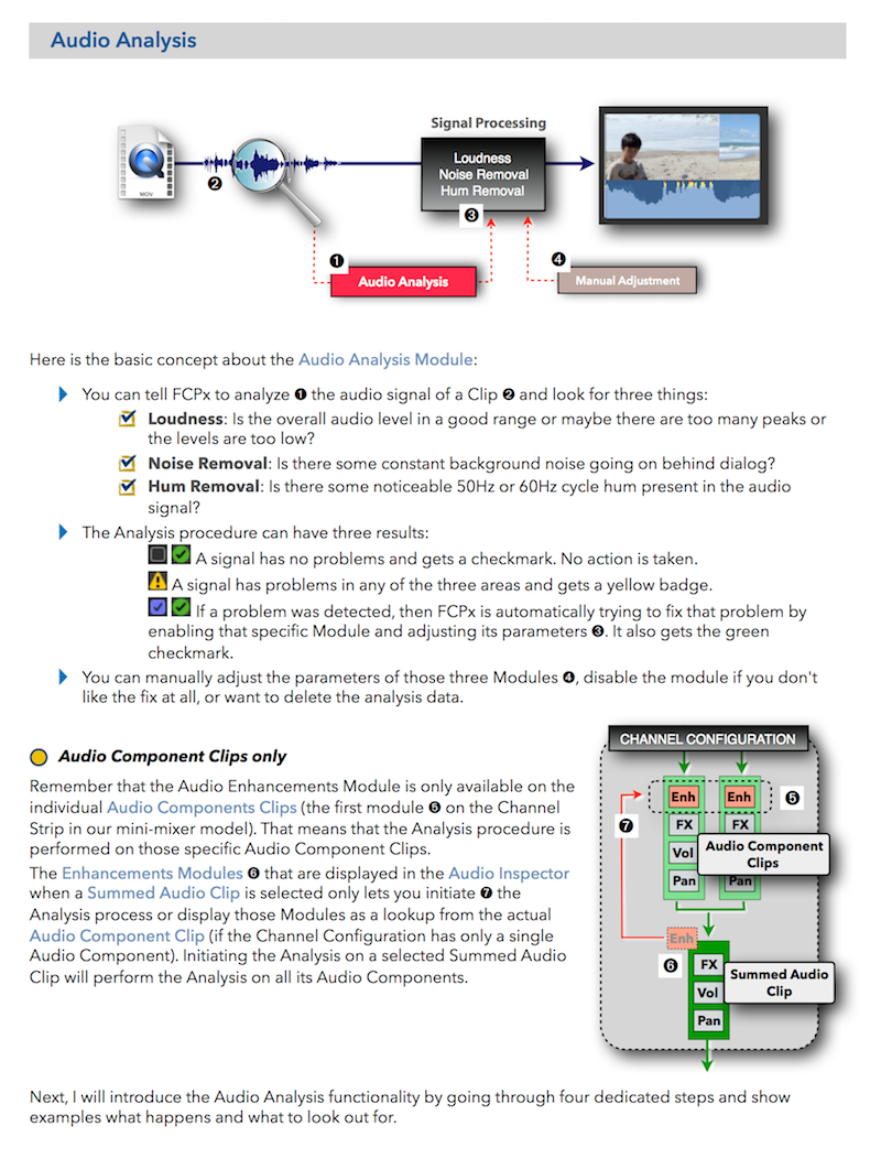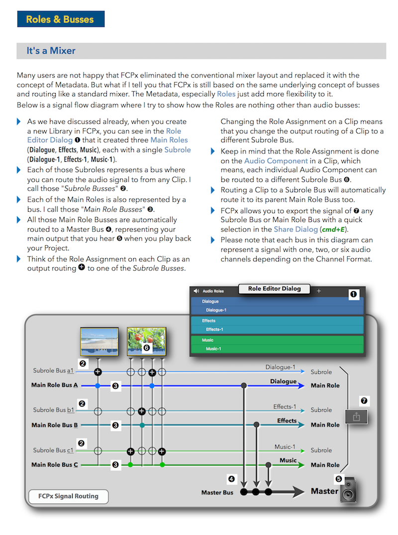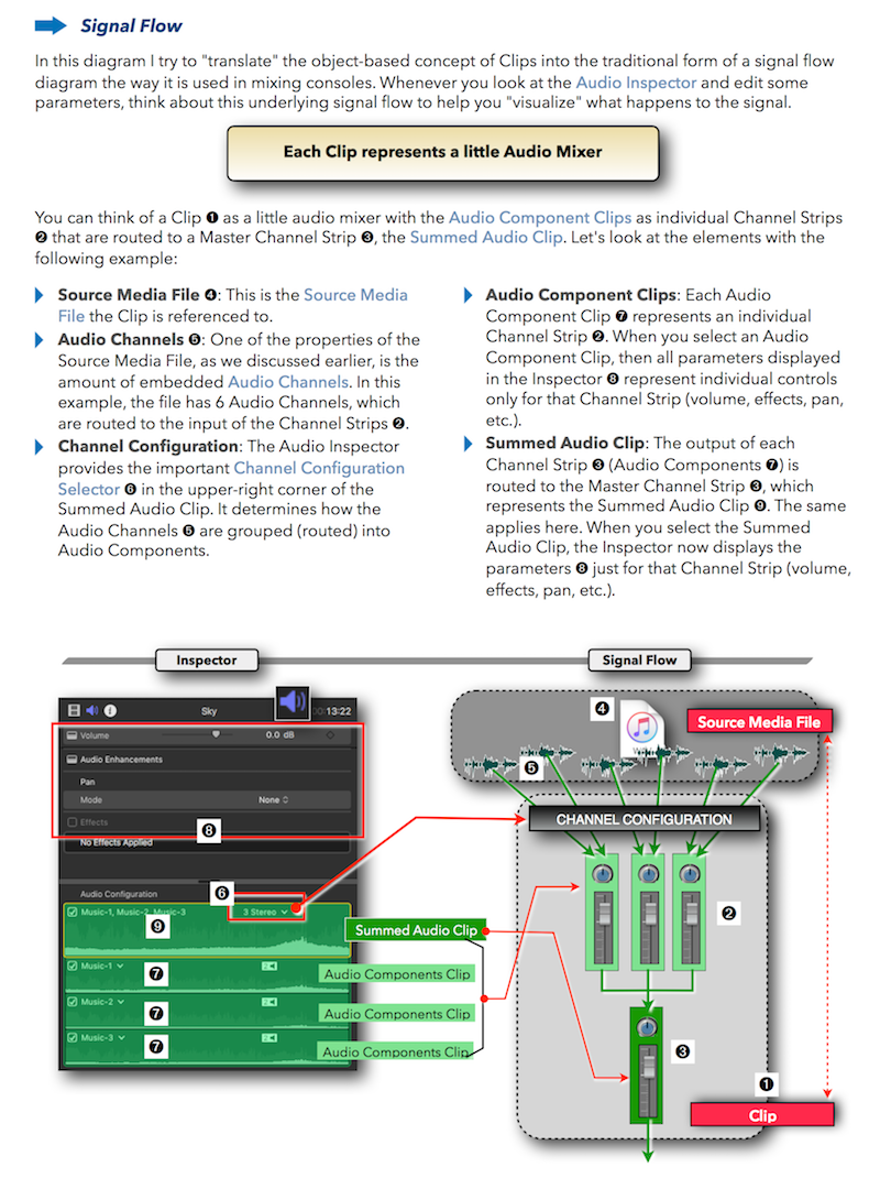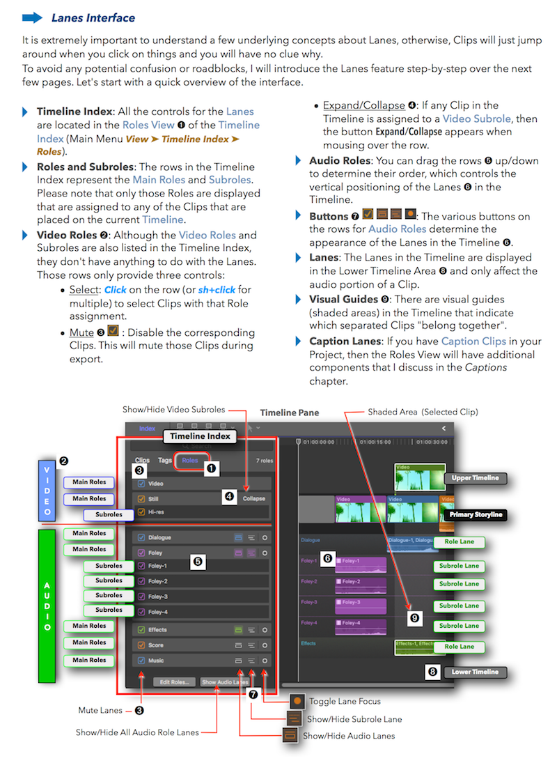 "Final Cut Pro X 10.4 - How it Works" (revised for v10.4.3) explains Final Cut Pro X in great details with lots of graphics and diagrams that are not found in any other publication or videos. In-depth explanations of all the features like Roles, Lanes, Color Correction, Captions, and 360° Video plus unique illustrations on how metadata-based audio mixing works in Final Cut Pro X.