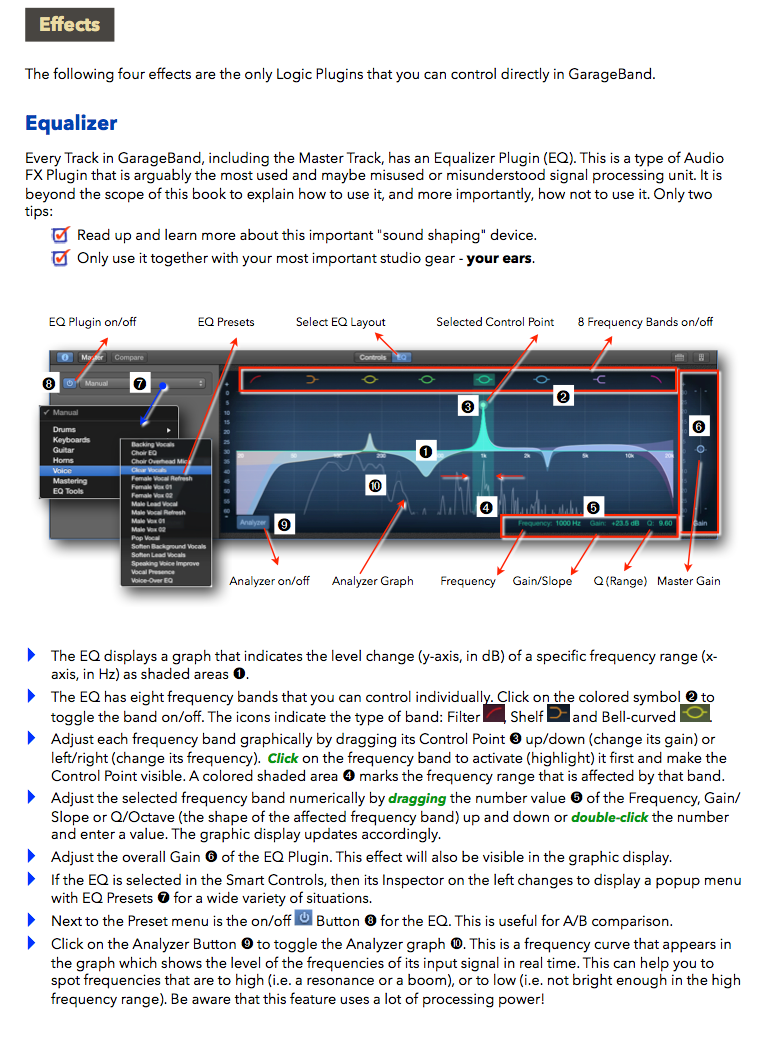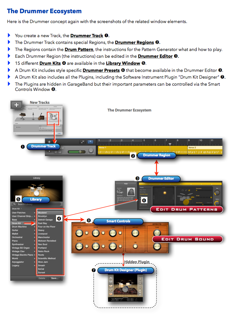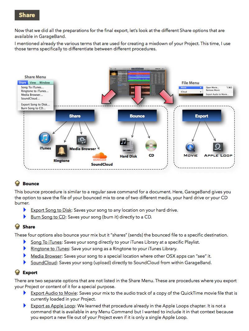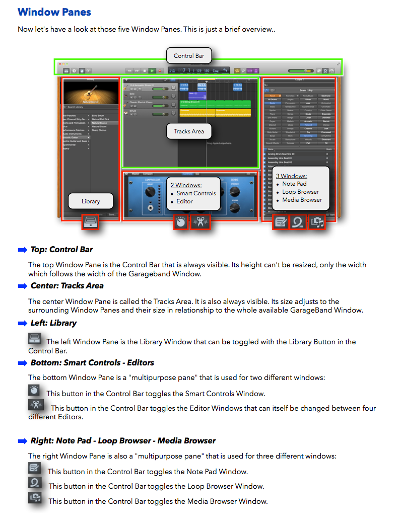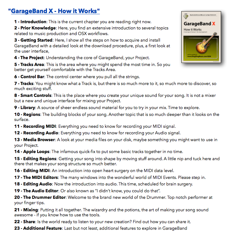 "GarageBand X - How it Works" explains Apple's GarageBand app with rich illustrations that are not found in the official documentation. The 321 pages letter size book helps you to understand all the concepts and workflows.