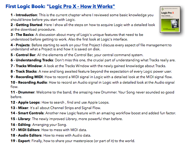 "Logic Pro X - How it Works" is the book to start with, the foundation for every Logic user. With rich illustrations that are not found in any other publication, YouTube video, and even the official documentation. The 396-pages book helps you to understand all the concepts, features, functionality, and workflows. After that, you can continue with the book "Logic Pro X - The Details".